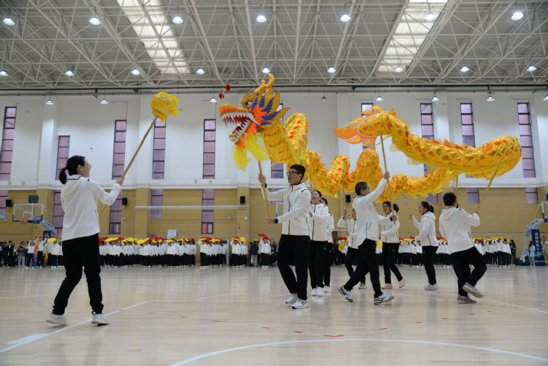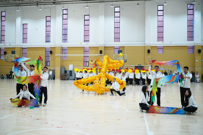 开幕式展演环节,一场融合传统韵味与时代活力的视觉盛宴精彩绽放。来自全校各基层工会的200余名教职工身着统一运动服,组成16列整齐方阵,在《霍元甲》快版激昂旋律中有序登场。展演现场动静相宜、亮点纷呈:方阵队员随指令灵活变换阵形,红、黄两色花朵道具交织流转,从进场时的密集队形,到表演中段的开阔方阵,再到结束时迅速收拢,最终巧妙地组合成一颗鲜明的红色爱心与“92”字样,表达对母校办学92周年的无尽祝福。与此同时,由本年度新评选出的11位“职业健康达人”舞动的金色大龙穿梭其间,依次呈现八字舞龙、龙点头、龙出宫等灵动招式,最终摆出苍劲有力的“龙”字造型。8名队员挥舞彩带龙,在铿锵韵律中划出七彩光影,交织成“92”数字图景,三者相映成趣,完美诠释“龙腾昂扬 活力科大”的主题。“健康护航,奋进担当!活力科大,筑梦远航!”的口号铿锵有力、响彻赛场,充分展现了江科大教职工积极向上、团结奋进的精神风貌。