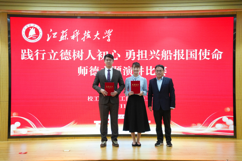 为深入学习贯彻习近平新时代中国特色社会主义思想,落实新时代师德师风建设要求,江苏科技大学工会、教师工作部、关工委联合举办了“践行立德树人初心 勇担兴船报国使命”师德主题演讲比赛。经过10月30日预赛选拔,14名选手从20名参赛教师中脱颖而出,晋级决赛。11月13日下午,决赛在长山校区图书馆B102报告厅隆重举行。校党委常委、副校长、工会主席李木旺,校党委常委、宣传部部长周春燕,关工委主任王建华,学生工作部部长朱金,工会常务副主席李明睿,党委教师工作部副部长蒋俊等出席活动。